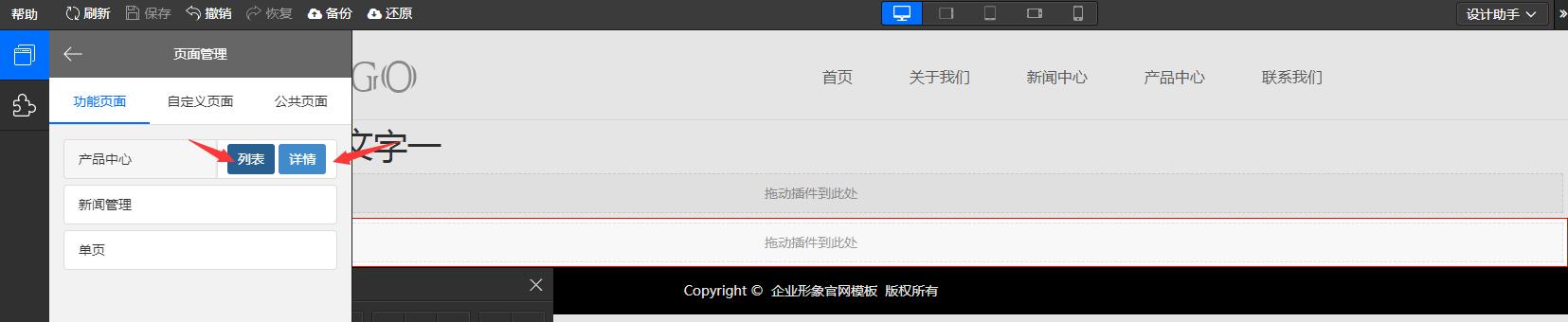上圖說明了,在列表/詳情頁設置結構,欄目中所對應的所屬功能頁面也會跟著這個設置好結構的頁面走。